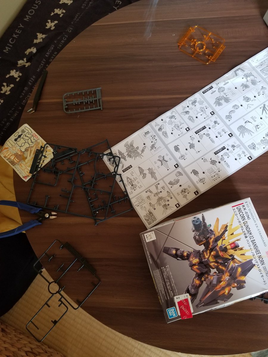 #ガンプラ好きと繋がりたい #ガンプラの画像貼るとRTされると聞いて #バンシィ #NTR 朝起きて見るとよくわからん光景が…。 昨日の帰りにバンシィ買って、疲れてたんでリビングに置いといて寝てしまったら、切られたランナーとシールが…妖精さんが勝手に作ったようです。マジか!?