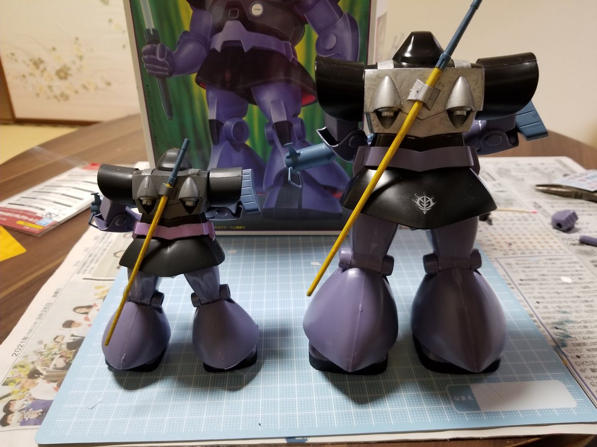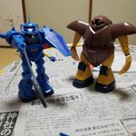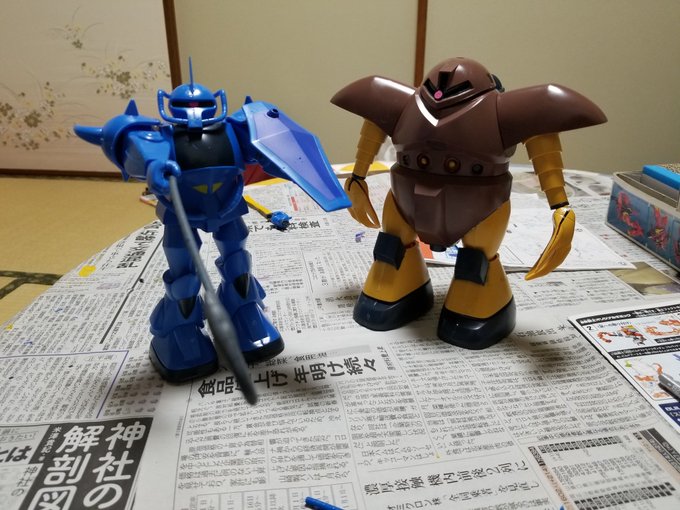 #ガンプラの画像貼るとRTされると聞いて #ガンプラ好きと繋がりたい #ガンプラ再販 #ガンプラ初心者 #旧キット #グフ #ゴッグ 息子らの作品完成です。旧キットとはいえ、1/100だったので塗装少なめ、パーツも大きめだったのがよかったみたいです。換気しながらの寒い中がんばりました。