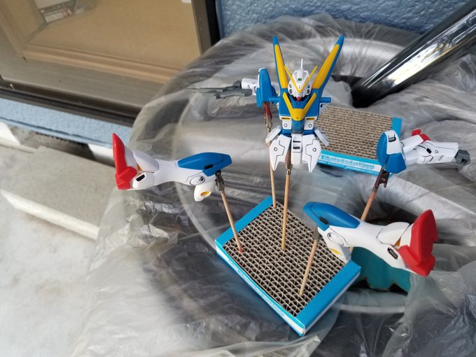 #ガンプラの画像貼るとRTされると聞いて #ガンプラ好きと繋がりたい #旧キット #V2ガンダム つや消しスプレー吹いてのV2ガンダムの陰干し。 ちょうどお腹も空いたのでご飯食べてから完成させます。