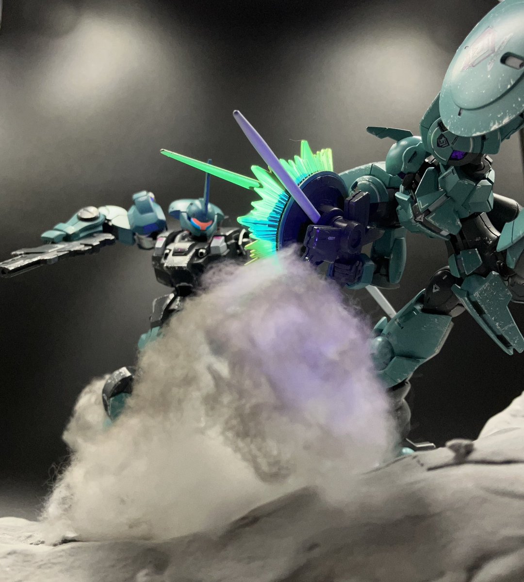 初ジオラマ完成しました! 第5話「氷の瞳に映るのは」でグエル先輩の戦闘シーンを再現してみました! 月面でアックスを振り下ろした際の衝撃をイメージしました。 汚れや塗装剥げもしています!今後に活かすためにも御意見いただけたら幸いです😆 #ガンプラの画像貼るとRTされると聞いて #水星の魔女
