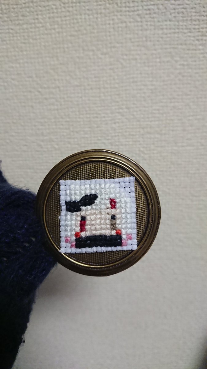 #ふぁんみぃと #にくあーと #クロスステッチ ゆずれもんさんのドット絵(肉片ちゃんとゆずれもんさんの子)を縫いました〜.。゚+.(・∀・)゚+.゚ サイズがちょうど良かったのでくるみボタンにしました! 猫耳肉片ちゃん可愛い❣