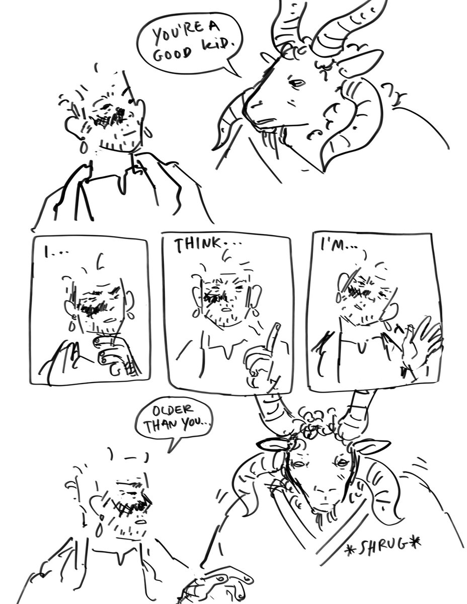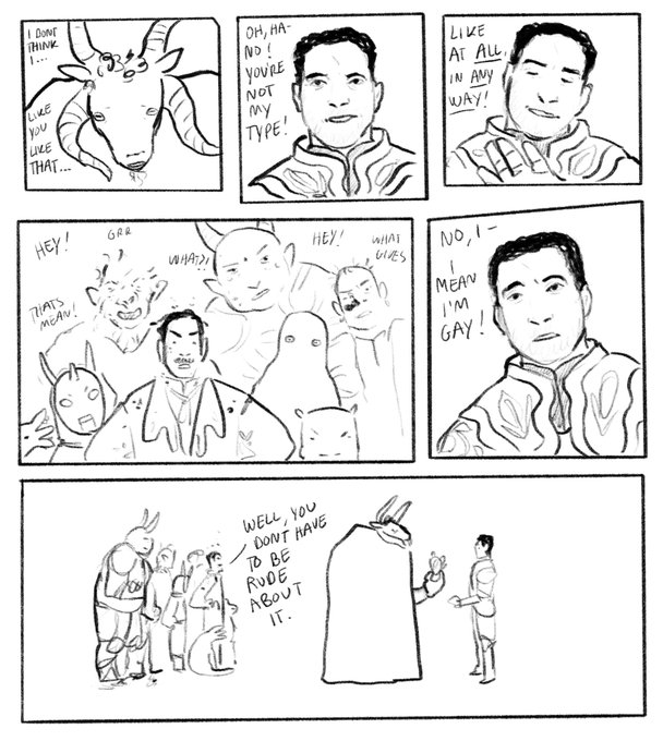 happey #secretsamol @twinewool! In the interest of not running out of space in the alt text boxes, here is the script for this comic docs.google.com/document/d/1M5… cw for discussion of a canonical character death 1/9