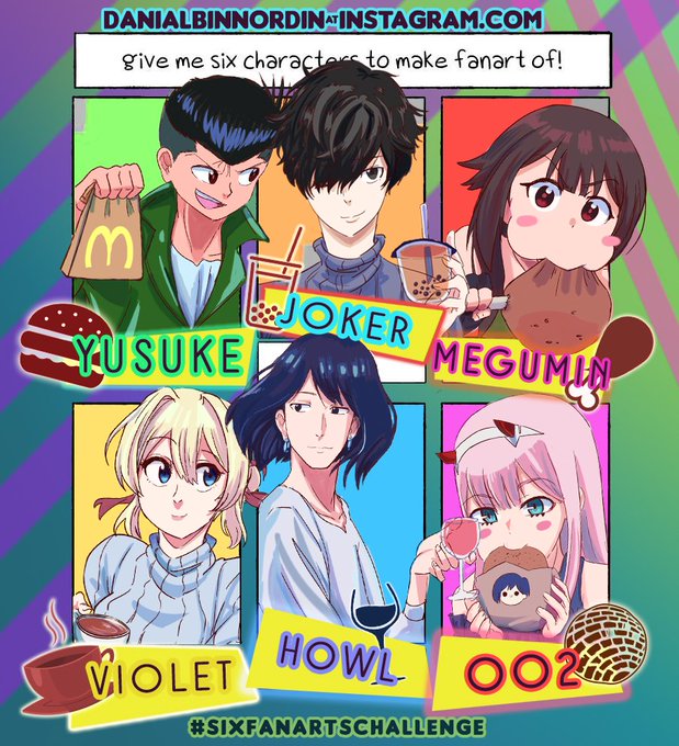SIX FANART CHALLENGE but WITH SNACKS 😍🍷🍩☕🍗🍔🥤😍 After 2 weeks of doing requests, I finally made it 💪😍 my very first new #sixfanartschallenge post is finally here! #SixFanartsChallenge #SixFanarts #anime #fanartanime