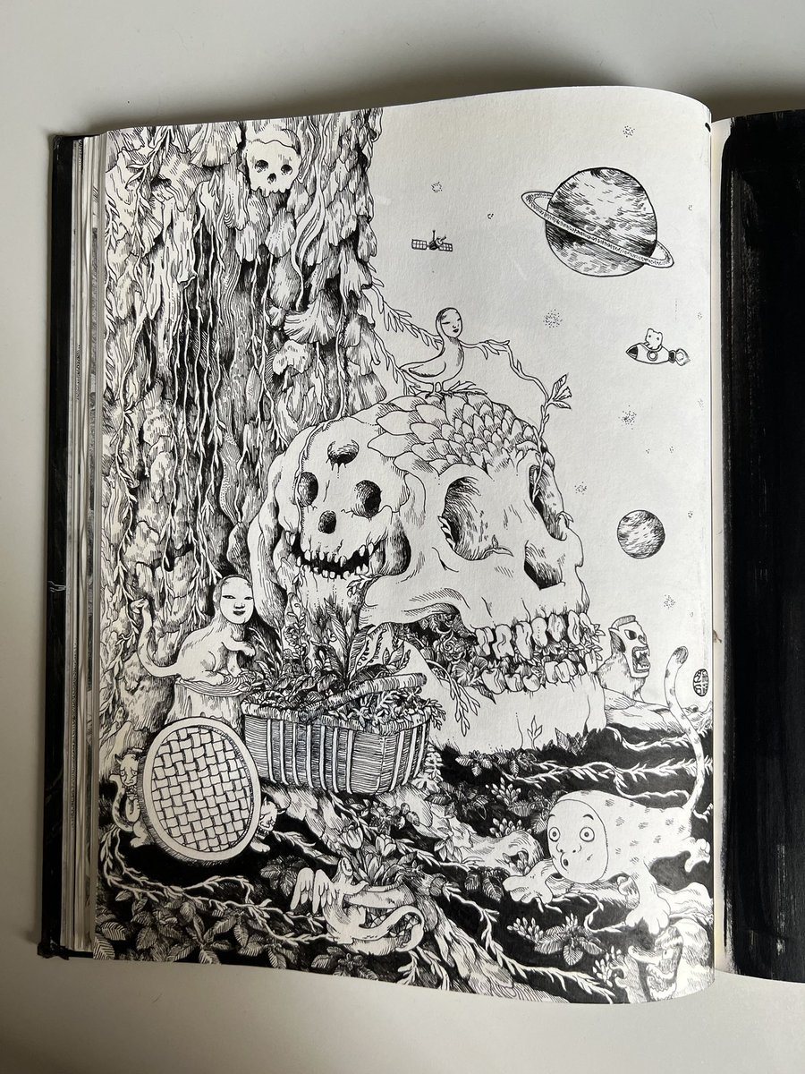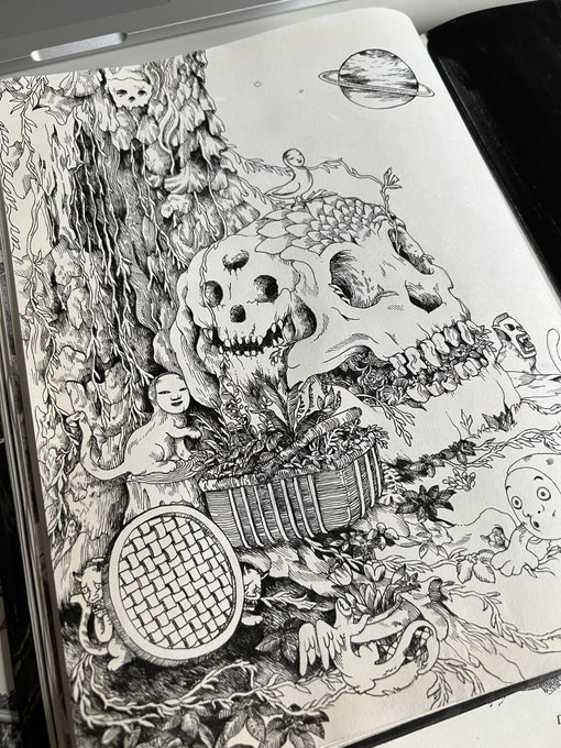 完成✨タイトルは、 不思議な、宇宙のどこかの惑星にいる生き物たちとドクロ にしようかなぁ… #illustration #sketch #sketchbook #絵 #ペン画 #イラスト #スケッチブック #イラスト好きな人と繋がりたい #絵描き