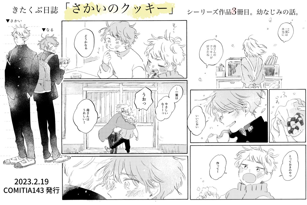 2/19(日) #COMITIA143 ▼お品書き 🍪新刊『さかいのクッキー』 男子高校生4人が放課後集まってゆるりと過ごす #きたくぶ日誌 シリーズ3冊目発行します。幼なじみふたりの過去編です。サンプルは引用RTをご参照ください。イベント後、本編全てあげます。本のみおまけ収録有。よろしくお願いします🌸 twitter.com/danpee88/statu…