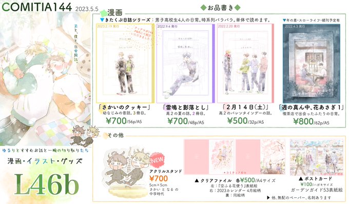 🎏5/5(金・祝) #COMITIA144 ▼お品書き 【L46b】あめのしわざ。 ティアマガに紹介いただいた作品(引用RT先)、男子高校生4人がゆるりと過ごすシリーズ、喫茶店で出会った年の差社会人のゆるりとしたお話、新作アクスタ、J庭43で頒布したグッズあります!よろしくお願いします🥳🍪 #コミティア144 twitter.com/danpee88/statu…