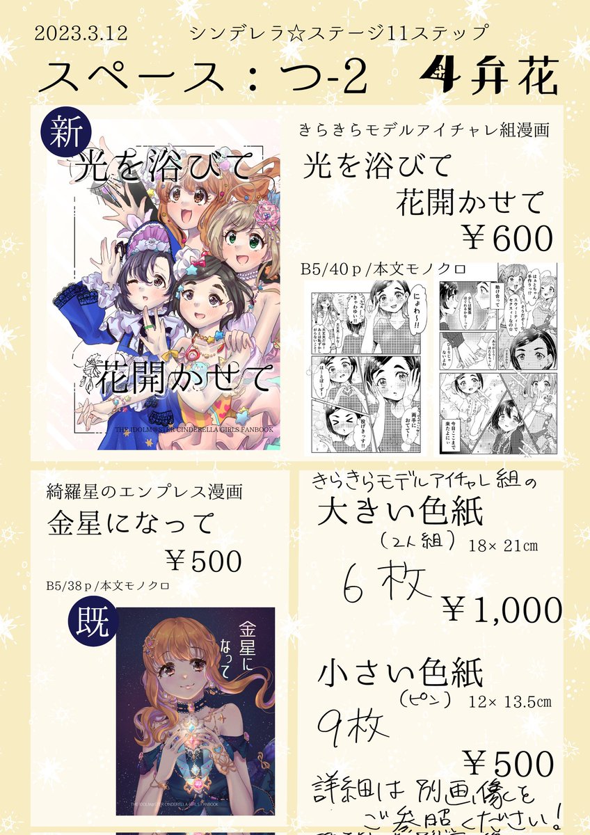 お品書き🌟 3/12 シンデレラ☆ステージ11STEP スペース:つ-2 サークル:4弁花 きらきらモデルアイチャレ組の新刊と綺羅星のエンプレスきらりちゃんの既刊、あと色紙を持って行きます! よろしくお願いします🌼 #シンステ #cin_stage