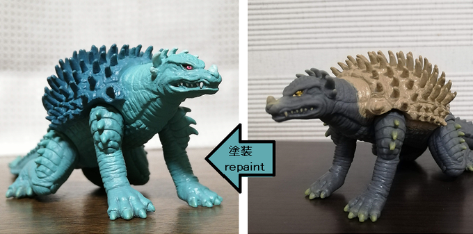 #アンギラス 2004 食玩ソフビをリペイント。 1955年の初代アンギラスや、スッポンを思わせる 淡い緑で塗ってみた。眼は蛍光ピンク! FWアンギラスのソフビは、ムビモンより こっちのが人相悪くてカッコいい。 #ゴジラファイナルウォーズ #ゴジラ #あなたのソフビ紹介 #オモ写 #シンギュラポイント