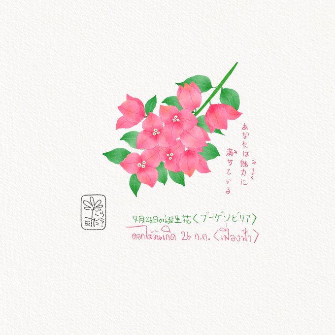419 607 ดอกไม้วันเกิดประจำวันที่ 26 กรกฎาคม "ดอกเฟื่องฟ้า Bougainvillea" ภาษาญี่ปุ่นทับศัพท์ว่า บูเกนบิริอะ ภาษาดอกไม้คือ เธอผู้ซึ่งเต็มไปด้วยเสน่ห์ 23/07/26 10:28