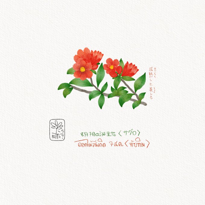 ดอกไม้วันเกิดประจำวันที่ 7 สิงหาคม "ดอกทับทิม pomegranate flower" ภาษาญี่ปุ่นเรียกว่า ザクロノハナ(ซะคุโระโนะฮะนะ" ภาษาดอกไม้คือ ความงดงามอย่างสมวัย