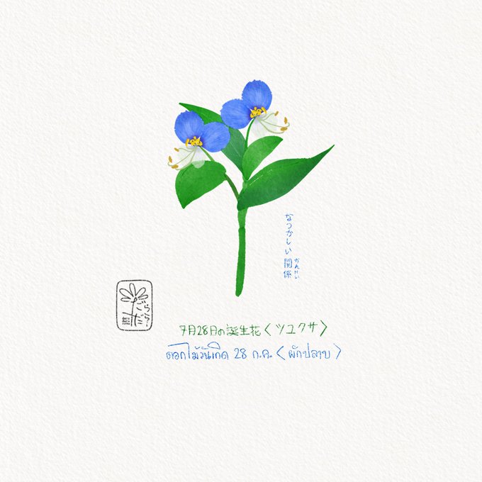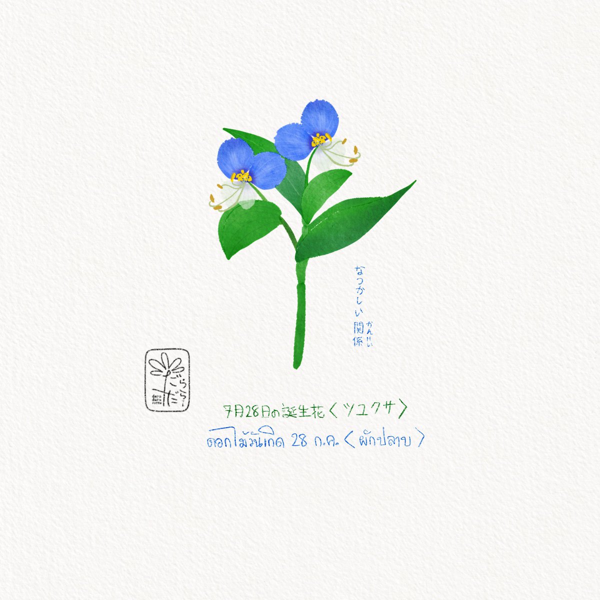 ดอกไม้วันเกิดประจำวันที่ 28 กรกฎาคม "ดอกผักปลาบ Dayflower" ภาษาญี่ปุ่นเรียกว่า ツユクサ(ทสึยุคุสะ) ภาษาดอกไม้คือ สายสัมพันธ์ที่หวนคิดถึง