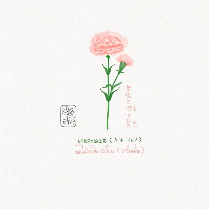 ดอกไม้วันเกิดประจำวันที่ 15 มิถุนายน “ดอกคาร์เนชั่น Carnation” ภาษาญี่ปุ่นทับศัพท์ว่า คาเนชน ภาษาดอกไม้คือ รักอย่างลึกซึ้งและบริสุทธิ์ใจ