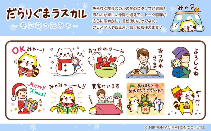 突然ですが、お知らせです✨ だらりぐまラスカルの❄️冬のLINEスタンプ❄️が配信になりました🎉 普段使いにはもちろん、クリスマス🎄や年末年始🎍など、冬のイベントにぴったりなスタンプです⛄ ぜひ使ってね😊 ⬇ご購入はこちらから⬇ 『だらりぐまラスカル 冬になったみゃ』 line.me/S/sticker/1768…
