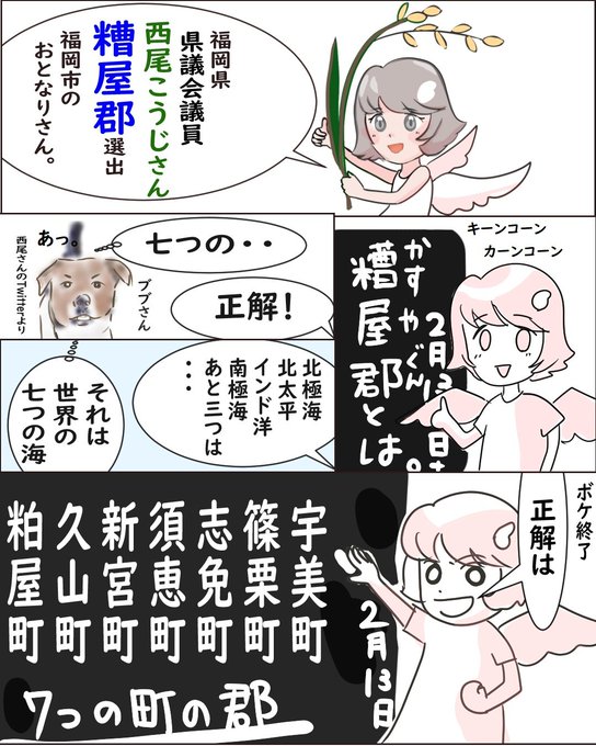 なんと 九州の福岡県糟屋郡(かすやぐん)は日本一! 何が日本一かは 漫画みたらわかります 妖精の名前は 「コメるちゃん」 コメQ(九州のQ)は実在するので…るにしました 7つの町名 読めない人は グーグル先生やSiriさんに聞いて下さい! #漫画が読めるハッシュタグ #糟屋郡