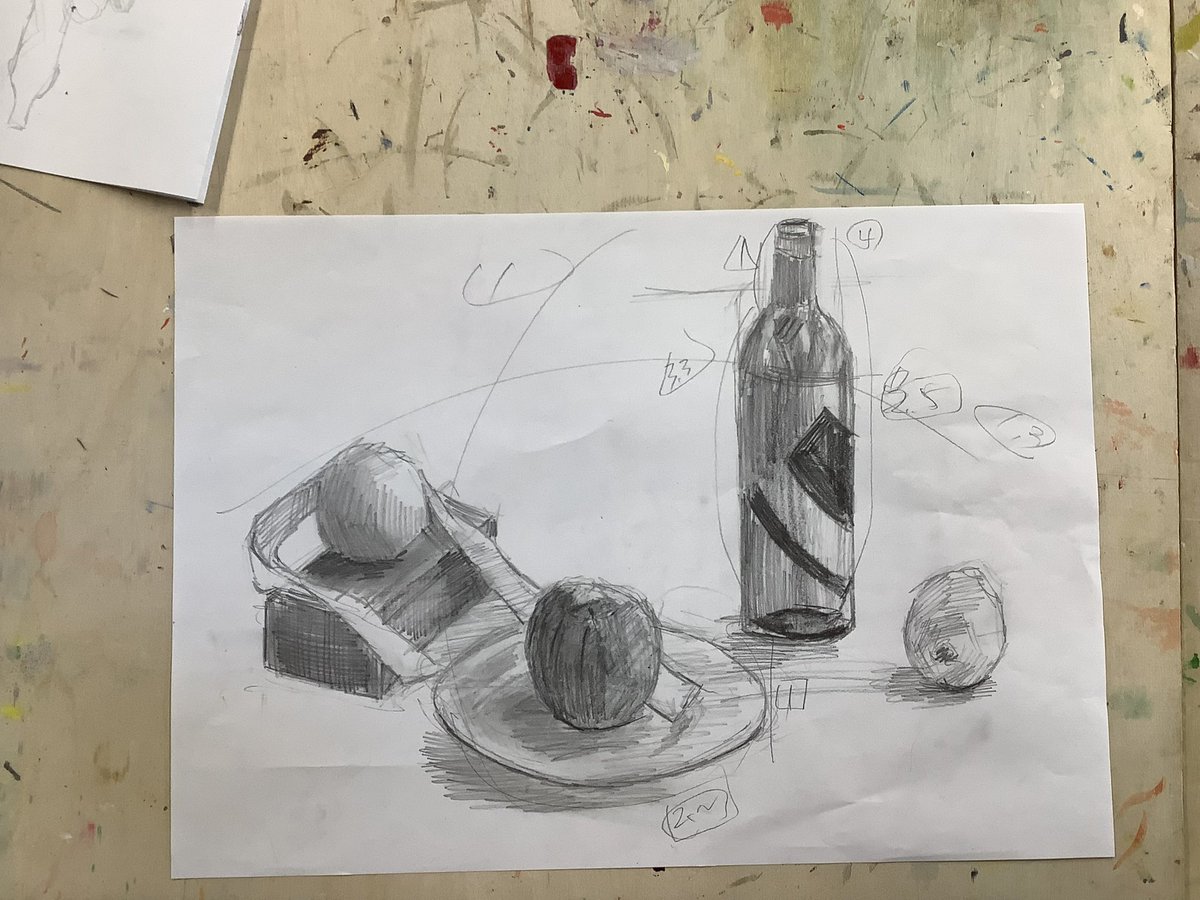 学校で油絵の静物を描き始めました。 ラフと下書き載せときます #静物画 #冬の創作クラスタフォロー祭り