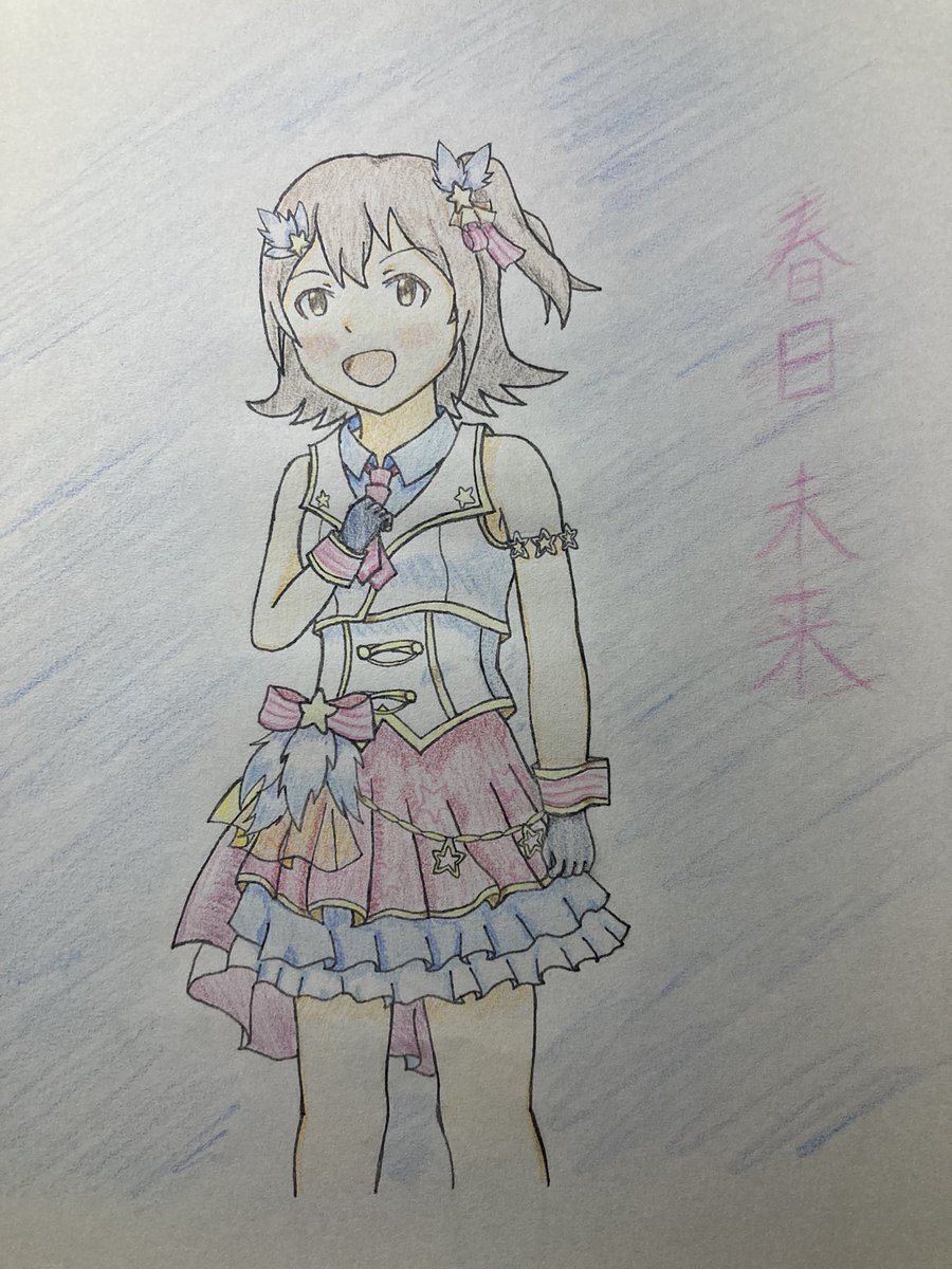 #今月描いた絵を晒そう ミリオン10周年と歌織さんお誕生日おめでとうの月 あと色鉛筆で塗った未来飛行未来ちゃん(直撮り ver)