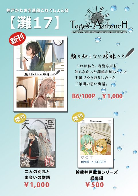 神戸かわさき造船これくしょん8のお品書きができました! 新刊「顔も知らない姉妹へと」をはじめ、前回の神戸で頒布しました既刊「天涯海鶴」と「# 鈴熊 in KOBE!!」も少部数ですが持っていきます。 #神戸かわさき造船これくしょん