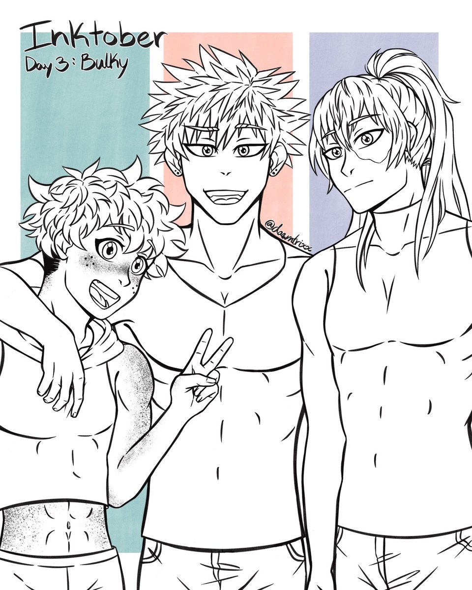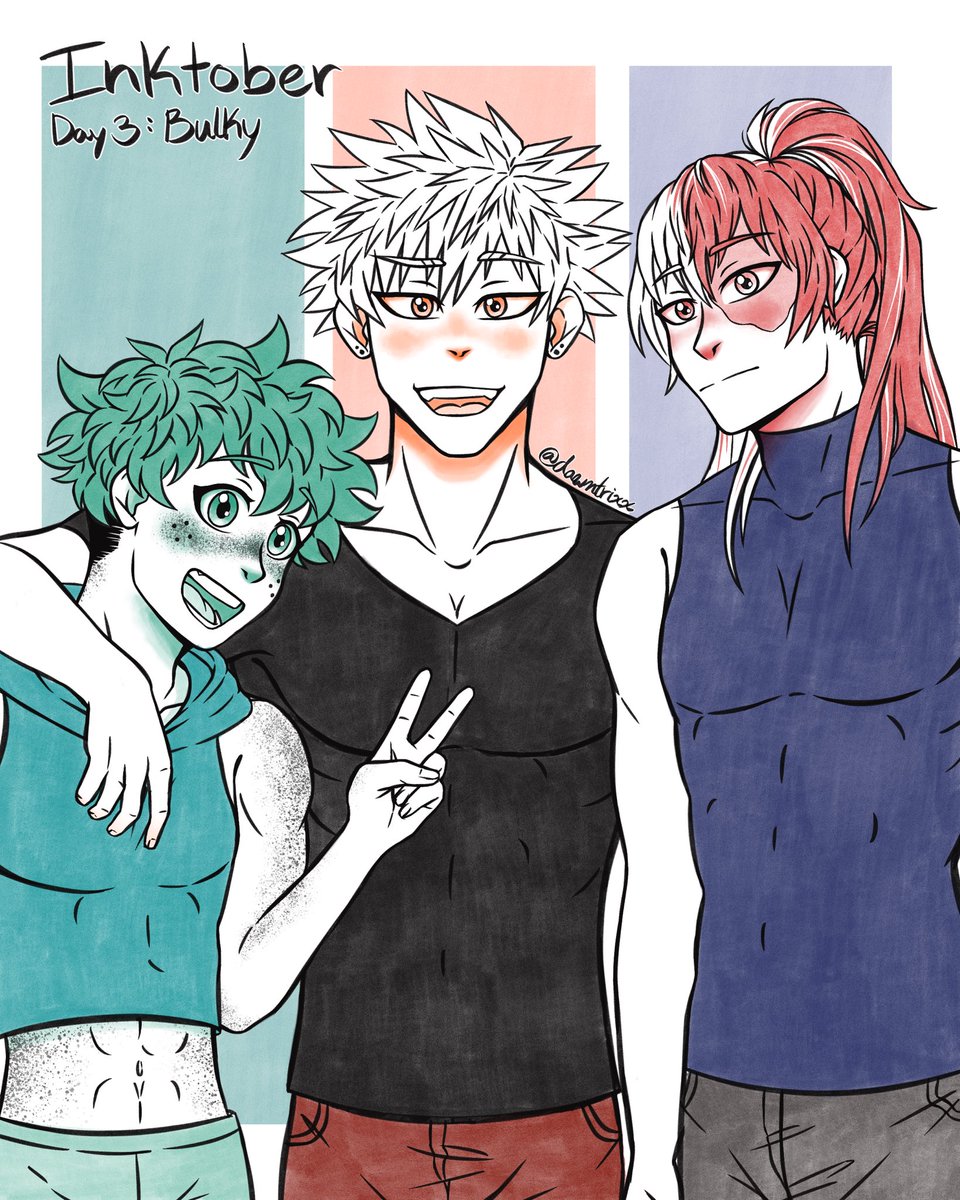 #Inktober Day 3: Bulky. Really just an excuse to draw these three as Pro Heroes. #inktober2020 #InktoberDay3 #bakugou #todoroki #deku #todobakudeku #bakudeku #bkdk #mha #bnha