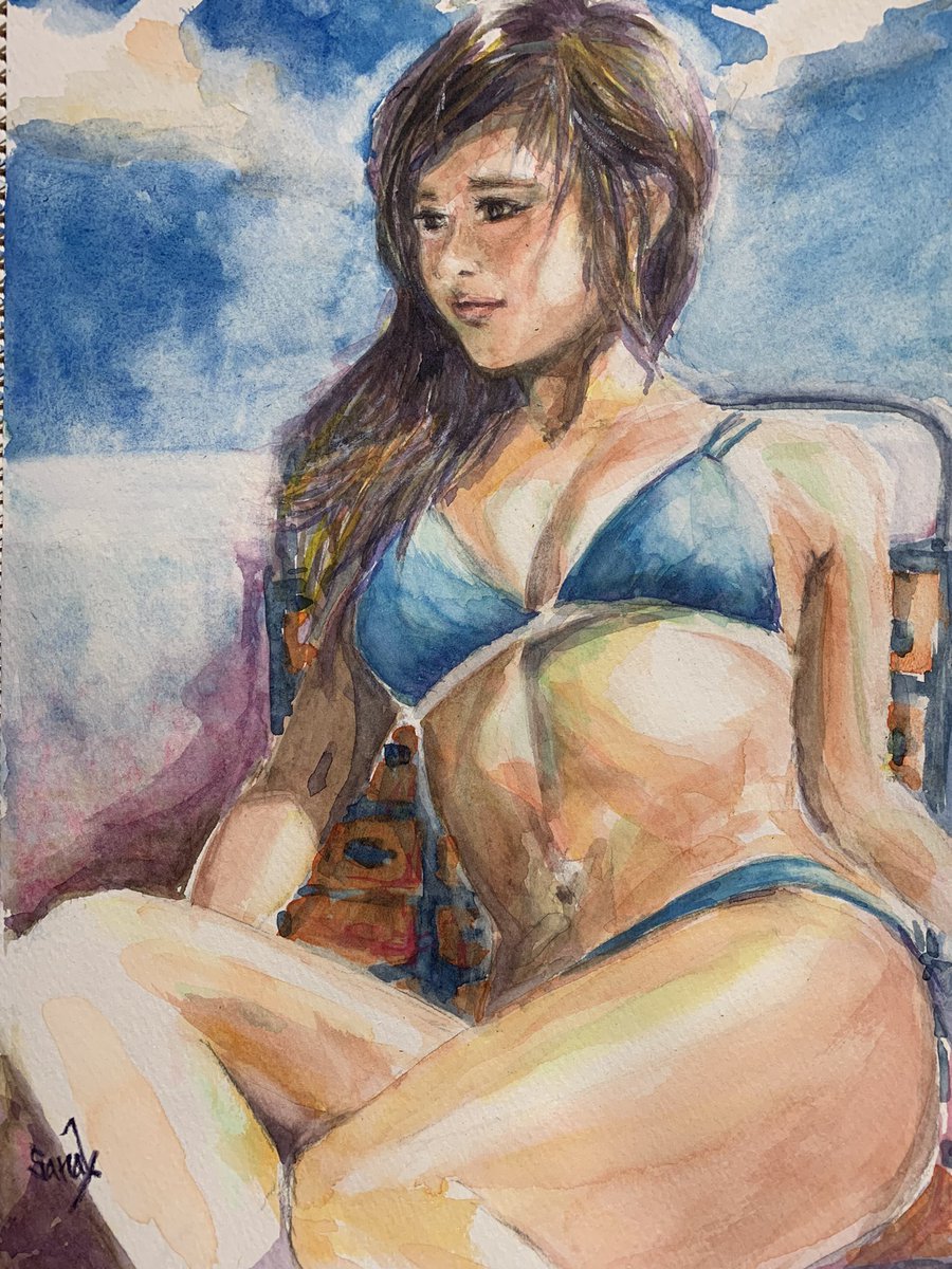 ビーチバレーボールの選手の肉体美を描きました。なんだか筆が進んでしまい、スレンダー美女の予定が、ちょっとナイスバティにしてしまってました💦 #水彩画 #透明水彩 #水着美女 #watercolor