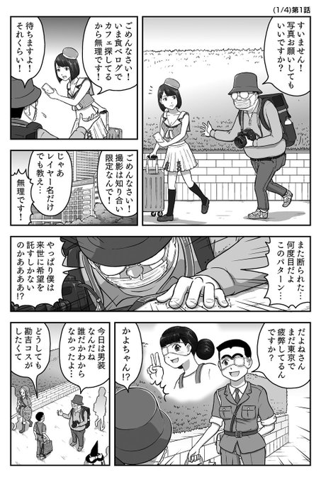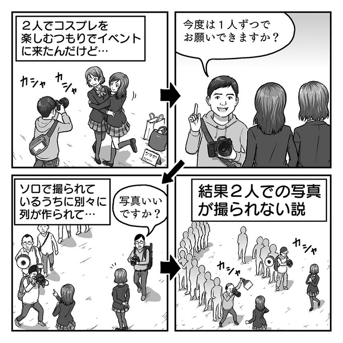 433 737 カメコ現場におけるツーショットおじさんの悩み…という漫画である。気づけばもうコミケの季節である。 「COSPLAY MODE 2019年5月号」掲載 cosplaymode.net 19/12/25 22:14