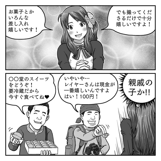 差し入れの方向性を間違うカメコたち…という漫画である。 「COSPLAY MODE 2019年5月号」掲載 cosplaymode.net