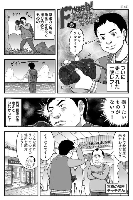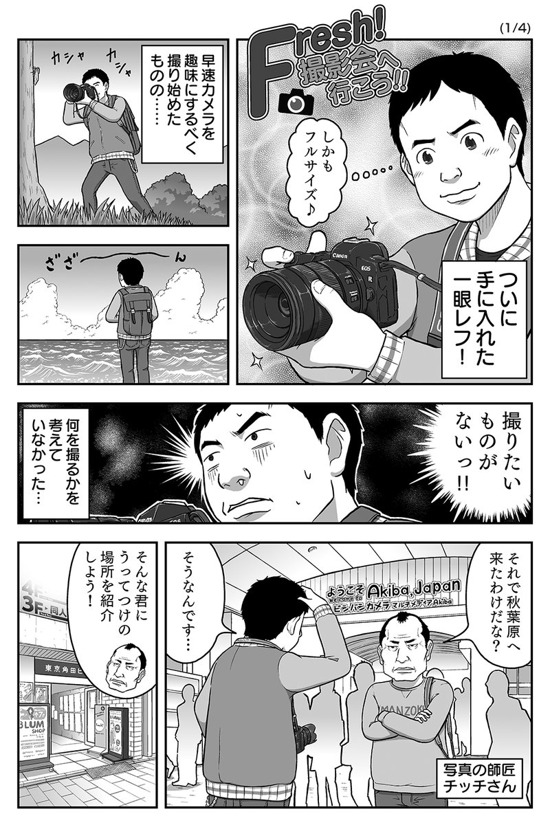 秋葉原で配布されている「Fresh plus」というフリーペーパーに4ページの漫画を描きました! 有名レイヤーさんがふらっと出ていたりするフレッシュ・フォトセッションという撮影会の漫画です! 漫画は次号も描く予定。