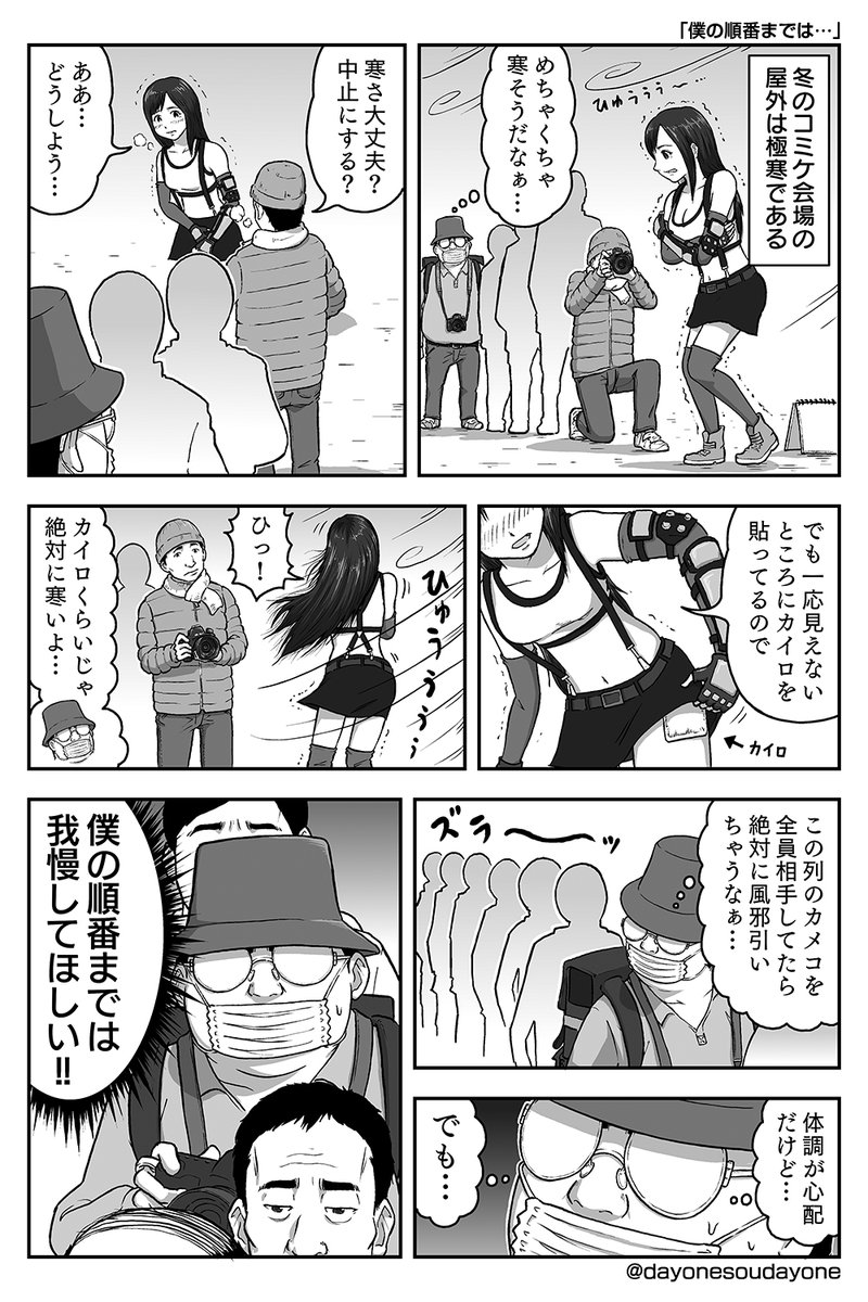 コミケで列切りを頼まれたカメコにしか伝わらない漫画である。