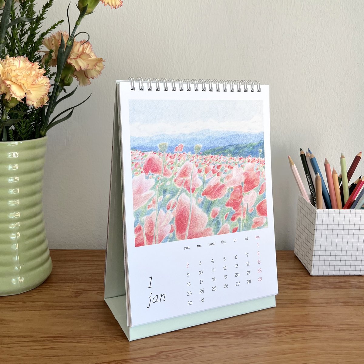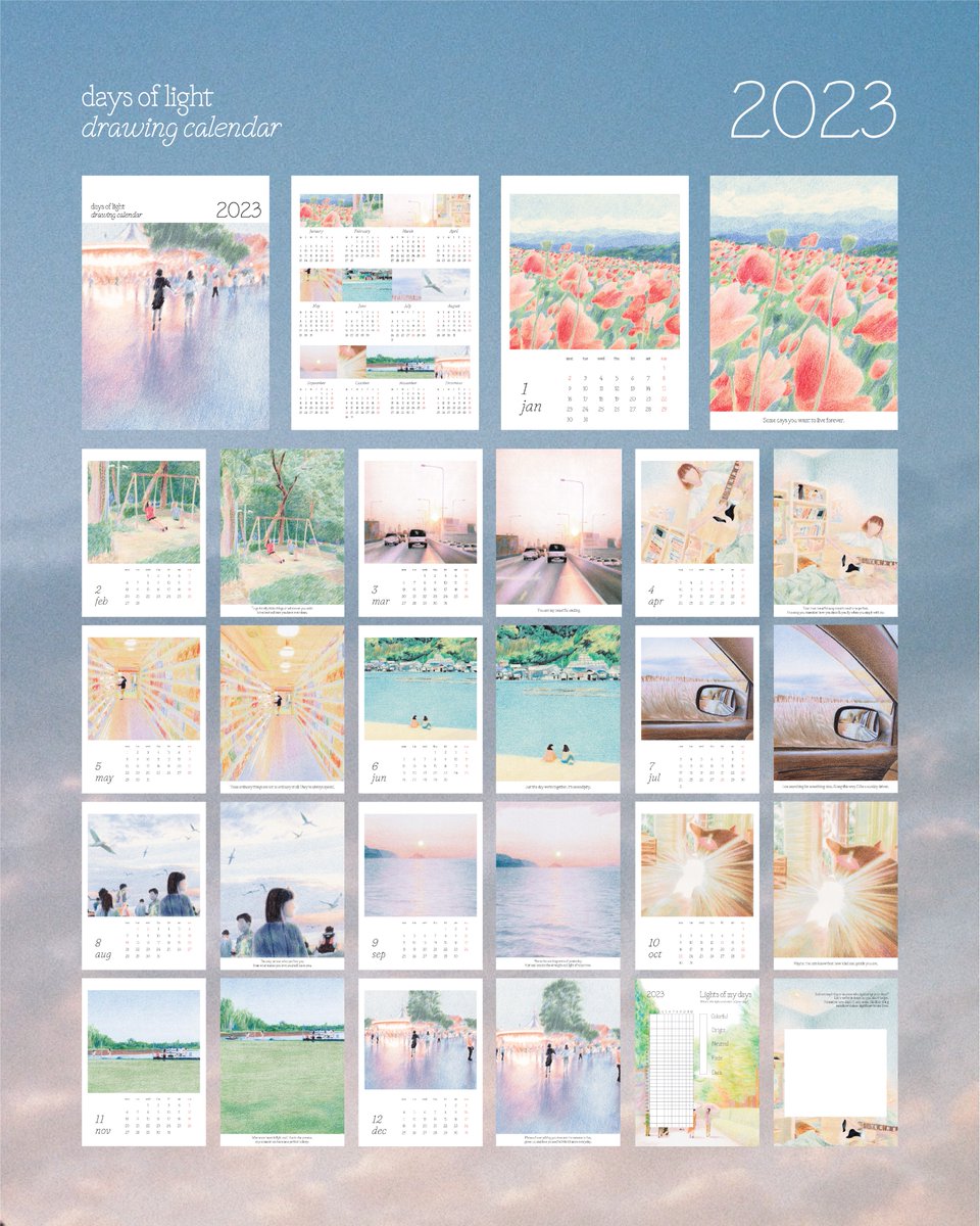 Days of Light Drawing Calendar 2023 🌅 ปฏิทินตั้งโต๊ะภาพวาดสีไม้ เป็นทั้ง Artprint ตกแต่งห้องไปในตัว 🫧🖼 นอกจากภาพวาด มี Quotes เล็กๆ ในทุกเดือนที่หวังว่าทุกคนจะได้พบเจอแต่วันที่สว่างไสวและความทรงจำที่มีสีสันในปีหน้า Pre-order Now - 16 dec 2022 ✳︎ shop.line.me/@975ndsnn/coll…