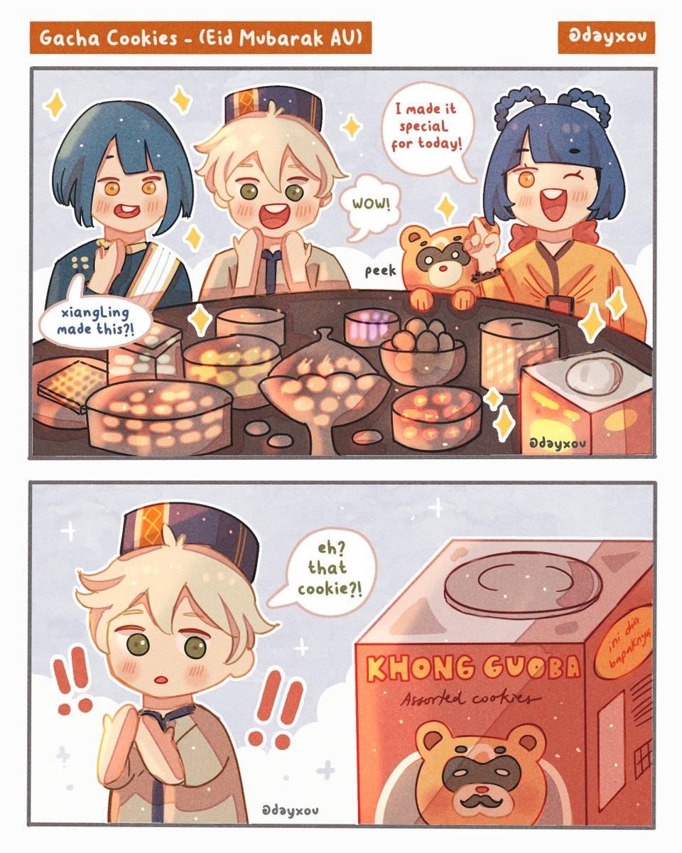 gacha cookies! 🍪✨ (ft. national team) eid mubarak AU [read L→R] brought this classic jokes but in genshin version! happy eid mubarak! ^^🙏🏻🌙💫 #原神 #genshinimpact #bennett #xiangling #xingqiu #guoba
