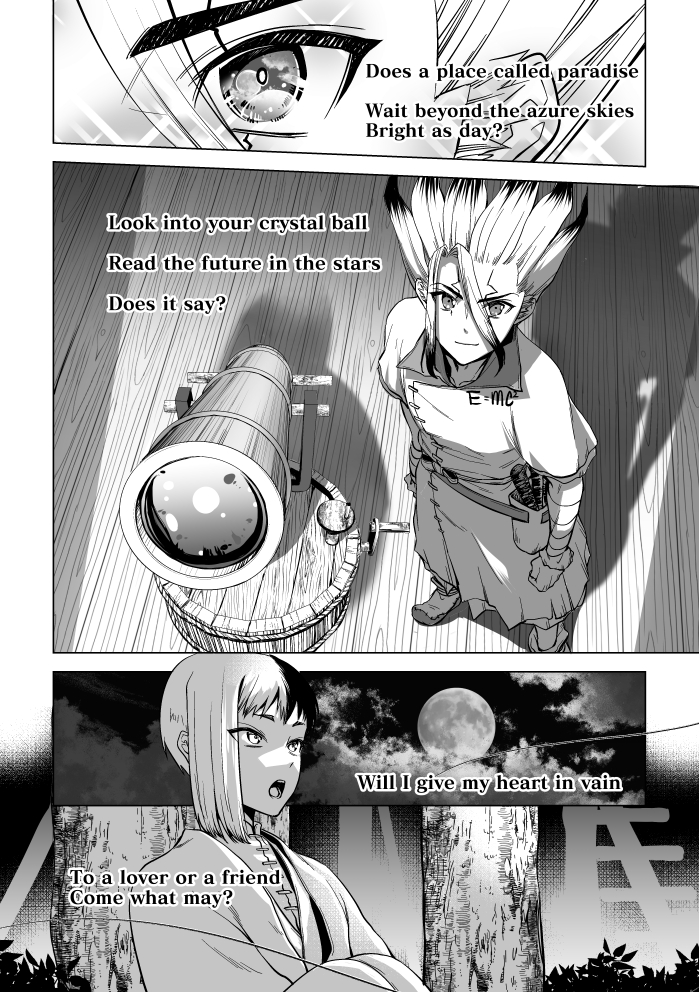 52 155 半年以上前に書いて忘れてたのを発見発掘。 昔のゲームの曲だけど歌詞がゲンちゃんから干空ちゃんへっぽいなって思って書いたやつ。です。 「石の荒野を夢と欲望を抱いて私は一人でやってきました」 23/05/31 14:15