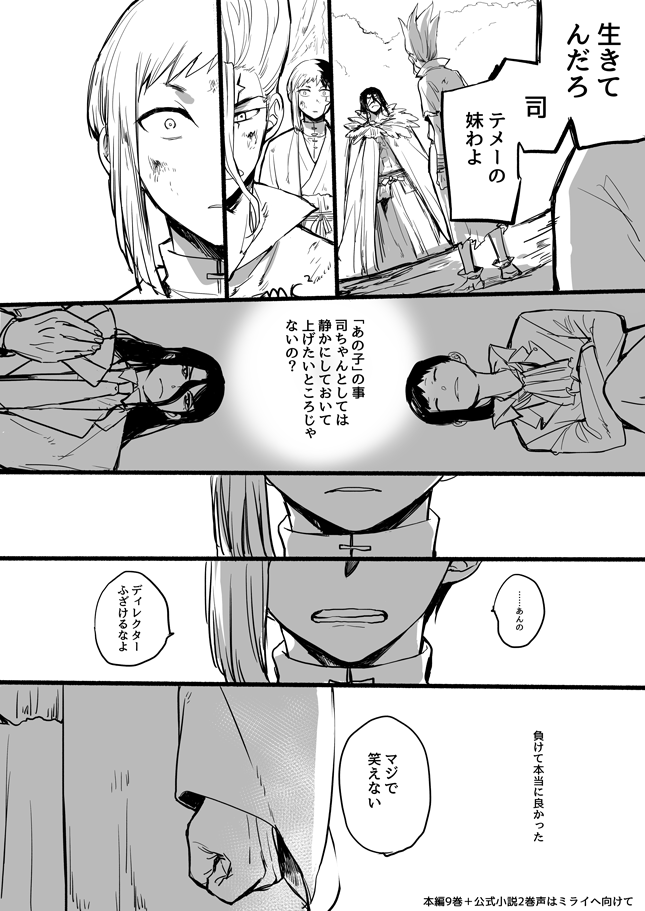公式小説2巻を膝に受けて立てません… こ…こ…公式?所構わず千とゲが挟み込まれているしゲンがなんか物凄い…あ?…なんか…ゲンの夢女になれやという圧を感じ??あ??「白黒《こくびゃく》の男」(失神) ありがとう、いいあさぎりです。(太●胃散) ※絵に本編台詞バレあり
