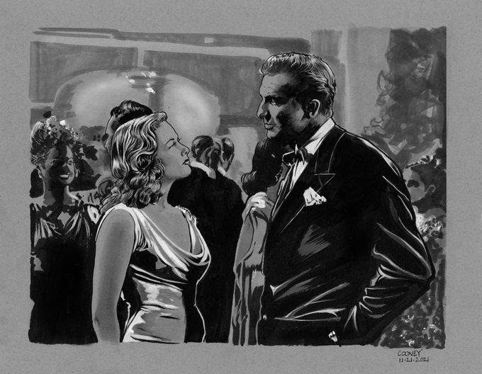 Gene Tierney and Vincent Price from one of my favorite noir films, LAURA. Mix media and toned paper. #NOIRVEMBER Laura is a detective novel by Vera Caspary. #genetierney #vincentprice #NoirAlley #noir #penandink