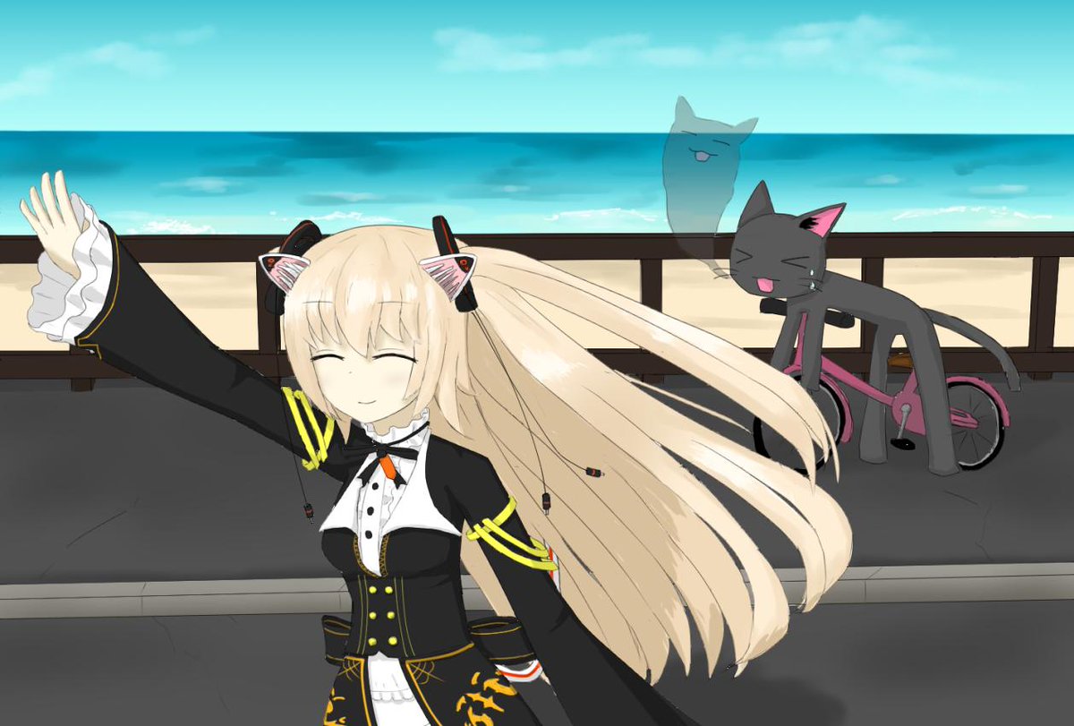 海沿いののらきゃっとさんとレンタルサイクルのノラネコPさん描きました #Nora_Cat
