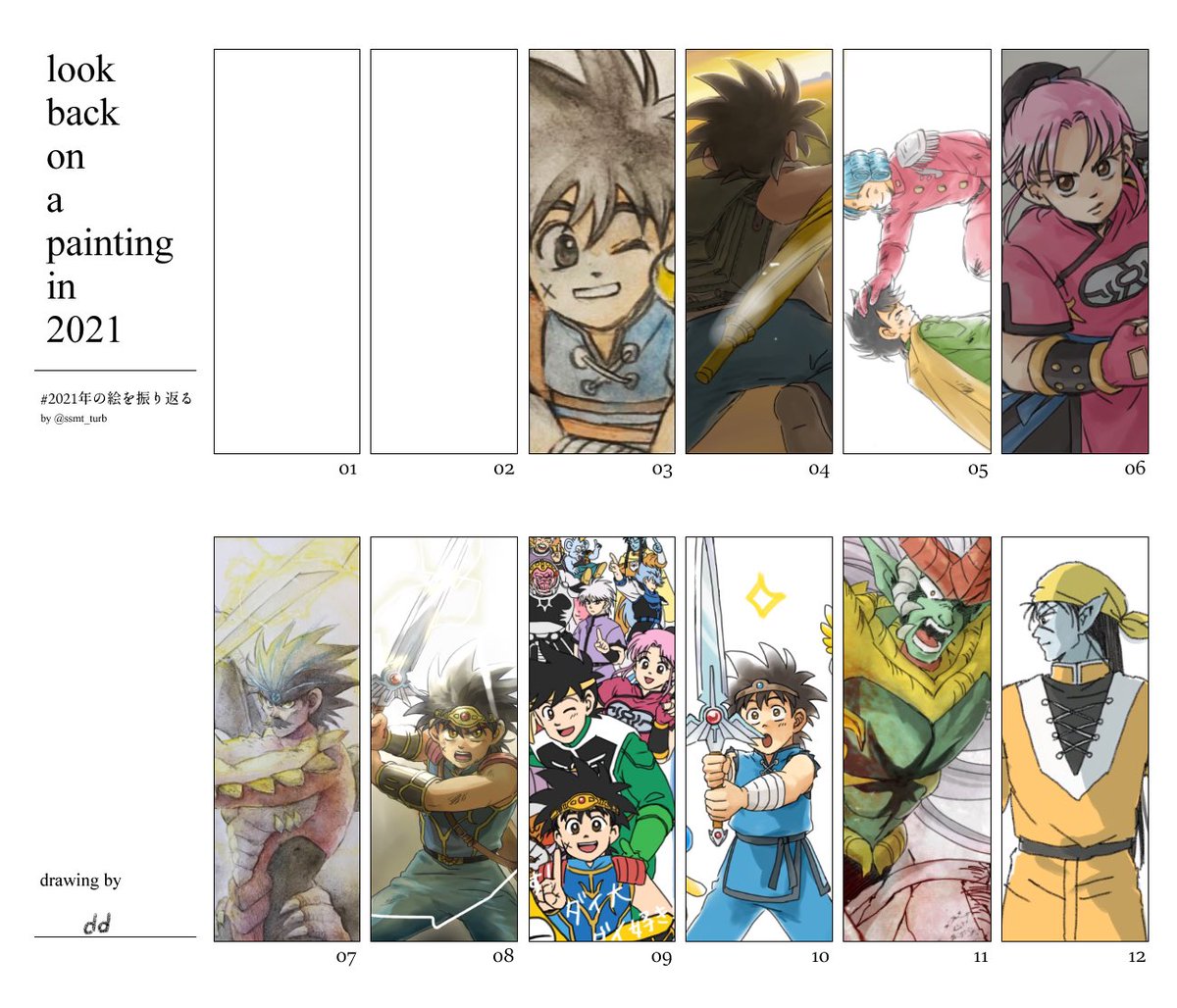 #2021年の絵を振り返る タグとテンプレートお借りしました! 描き方も塗り方もバラバラだけどどの絵にも思い出がいっぱいだ…。3月のダイは久しぶりに絵を描くドキドキ感とか後ろめたさ、それを上回る楽しさが凄かったなぁ😭昨日の事もすぐ忘れるのにこういう気持ちは細かく覚えていられるの不思議!