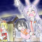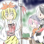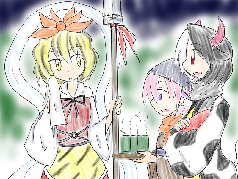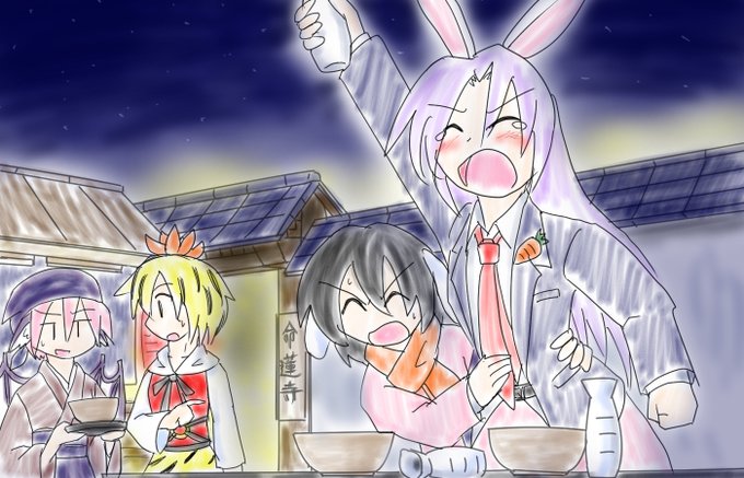 #東方 #ミスティア・ローレライ #牛崎潤美 う「大晦日なのに大変だねぇ」 と「これも務めですから」 み「まぁこれでも飲んで暖まんなよ」 と「こ、これはもしや般若t…」 み「南無三されるわ!甘酒だよ!」 な(…誰もあの槍に突っ込まない恐怖ッ!) 描き納め! 今年一年ありがとうございました!