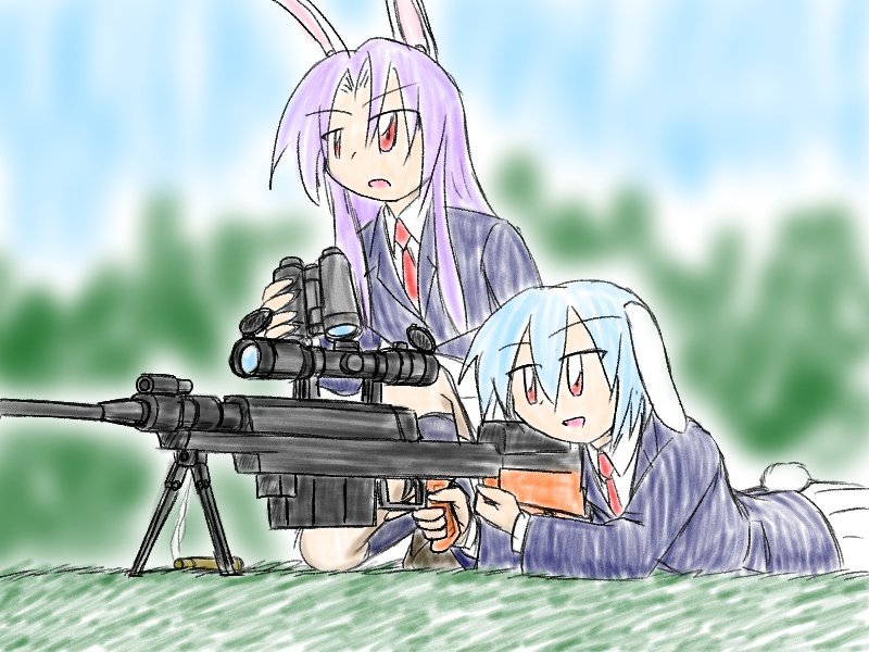 #東方の90分お絵描き #鈴仙・優曇華院・イナバ #レイセン #東方 「…ビューリフォー。腕上げたね」 「いえいえ、センパイほどじゃないですよ」 狙撃兎's withヘカ様 何かやらかしたのか低空飛行中のブン屋を小高い丘の上から狙撃中 ※ただし妖怪なので直撃しても「痛ってぇ!」で済む
