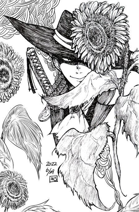 3 83 #2bropics やっと終わった。 鬼装備に鬼装飾ww 慣れない横顔に初めて描いた弓の構え。何で弓なのに刀あんの?と思いながら描きました。資料は🎧先生の動画内のムービーのみです。これでもかなり簡略化しましたが疲れた!!😀 一枚目は全体を二枚目は🎧先生を少しアップにしてます。 22/07/12 23:33