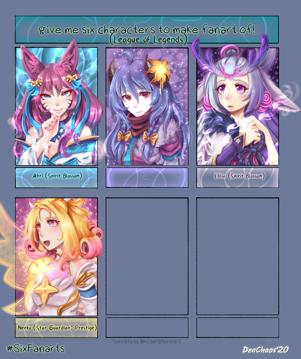 I did it,yaaay! People who play LoL with me chose five girls and said that I can chose skins myself. At first I wanted draw one of my fav boyz:Ekko,Ezreal or Rakan,but realized,that all other are girls. So I chose Presitige #Neeko #SixFanarts #LeagueOfLegendsFanart #SpiritBlossom
