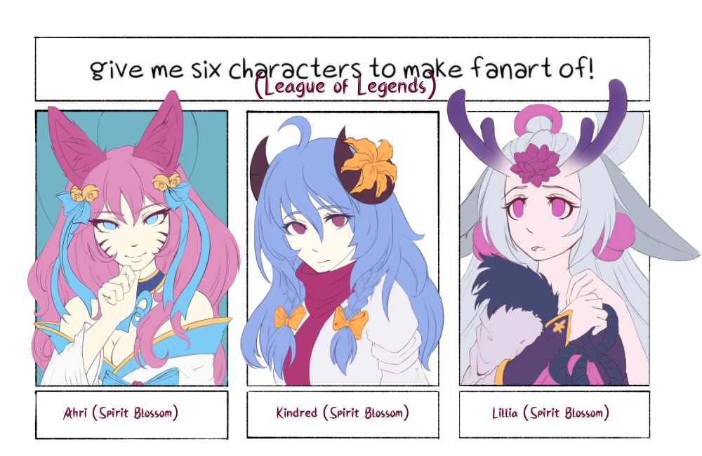 WIP of the first three of my #SixFanarts , hehe. Yes, I'm late with this challenge, but better late than never? #LeagueofLegends #LeagueOfLegendsFanart #ArtofLegends #Ahri #Kindred #Lillia #Spiritblossom