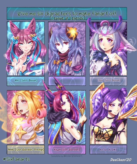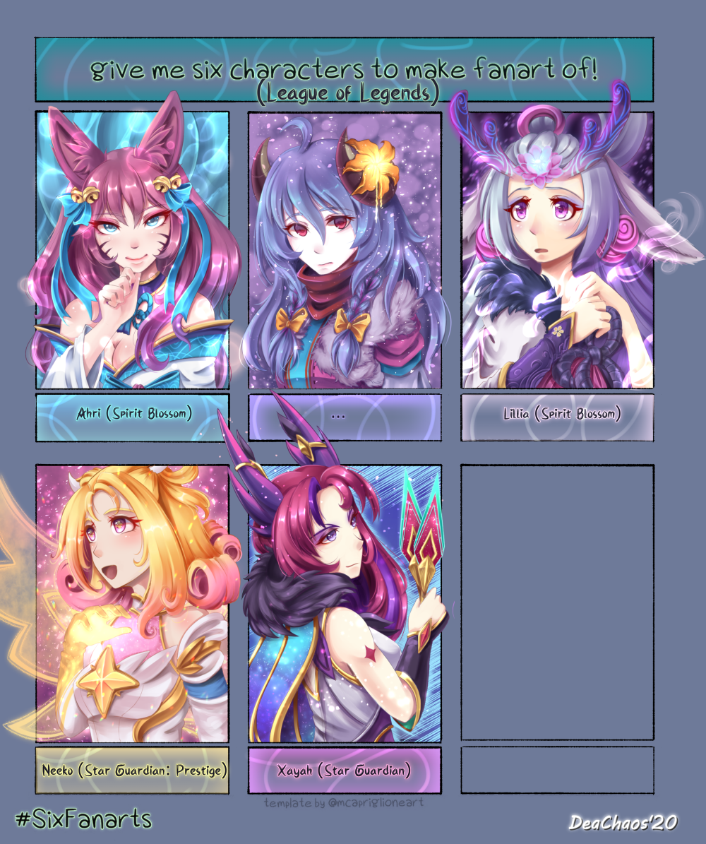 Only one more girl left, hoho. I'm so excited to finish it!~ #SixFanarts #LeagueOfLegends #LeagueOfLegendsFanart #ArtOfLegends #Ahri #Kindred #Lillia #Neeko #Xayah #Spiritblossom #StarGuardian