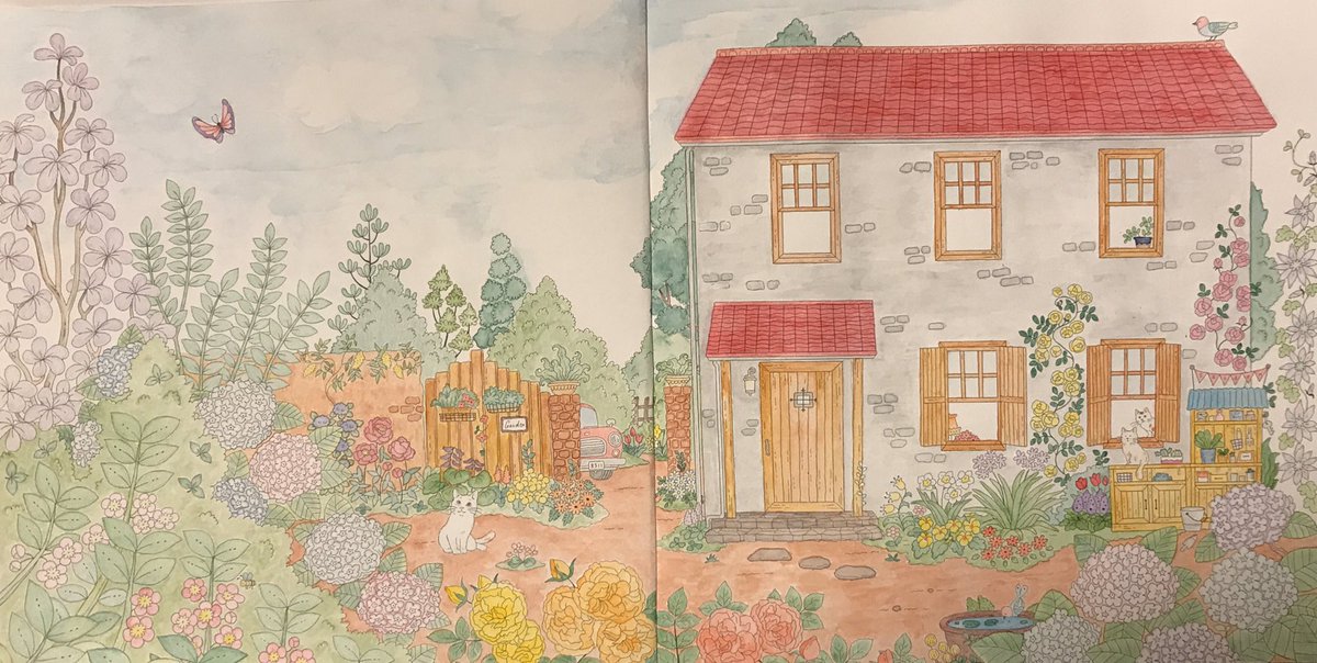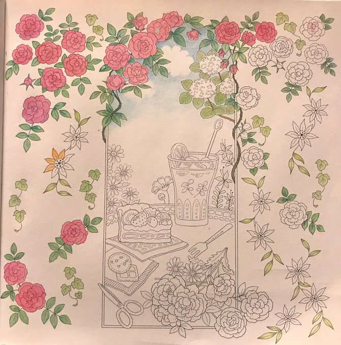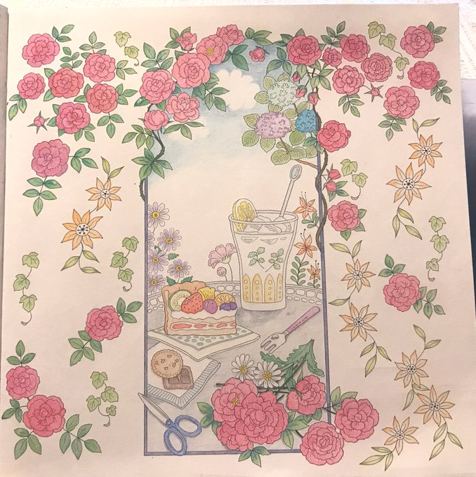 完成しました~😆影の入れ方とかよく分かっていませんが💦何とかカタチになったかな😅混色の仕方とか塗り方を学べた一枚となりました。道のり長かったけど楽しく塗れたので良し。 #大人の塗り絵 #やすらぎの花園~夢みる猫の散歩道~ #色鉛筆
