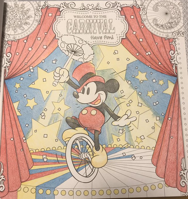 途中経過です😆今回は #色彩豊かな幸せディズニー塗り絵レッスンブック より赤、青、黄でレトロアメリカンポップを目指して塗っています。と言ってもお手本を見ながらなのであまり難しく考えずに塗っています(笑)ベタ塗りもムラなく塗れるようになったかな🤔 #大人の塗り絵 #色鉛筆
