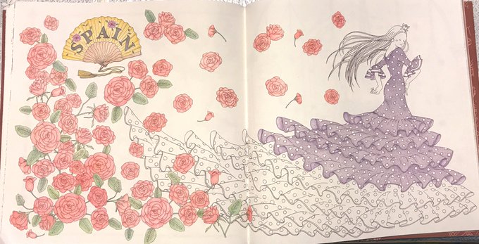 ベタ塗りに疲れ、新しい色鉛筆で塗りたくて塗りたくて浮気中(笑)コーリン色鉛筆疲れない😳凄いなぁ。自分の技術がないので混色とか色々できないけど楽しい😊そして、また見開きで大変なの選んでしまったから道のりは長い🤣 #大人の塗り絵 #色鉛筆 #民族衣装のぬり絵ブック
