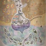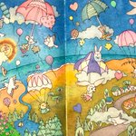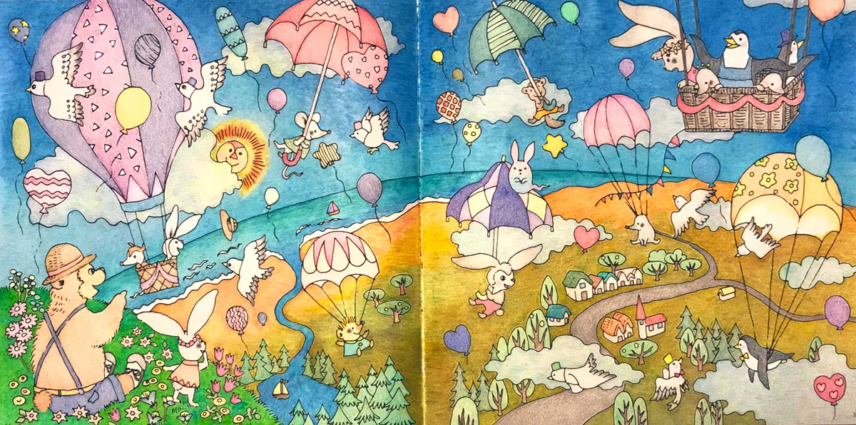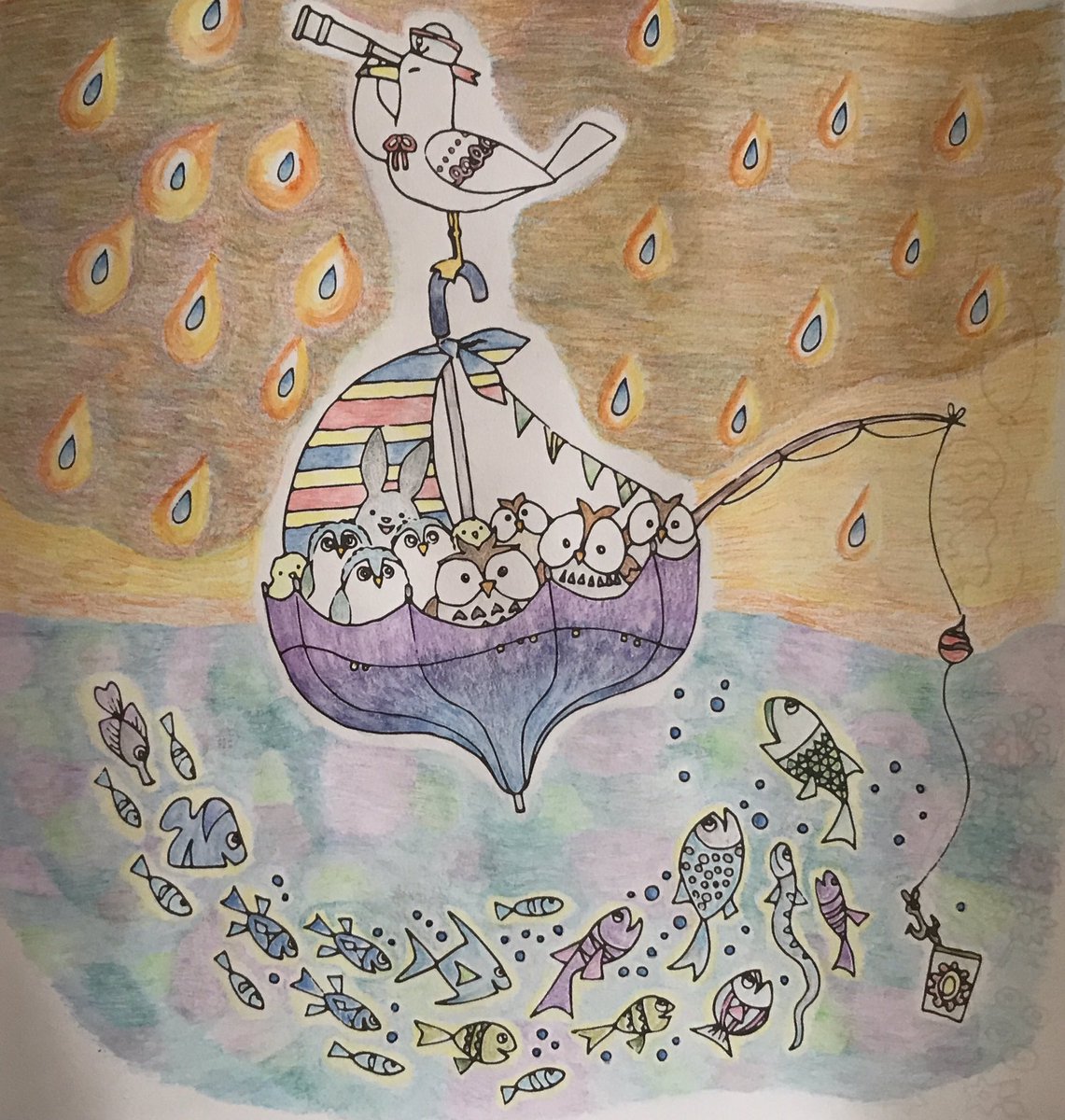 #どうぶつたちのFantasySeason より6月のページが完成しました😆夕日が出てるのに雨が降っているイメージで空を塗り進めたら凄い色になってしまいました(笑)使用色鉛筆はステッドラーカラトとコヒノールマジック色鉛筆です。海と傘の船はお気に入り😊 #大人の塗り絵 #色鉛筆