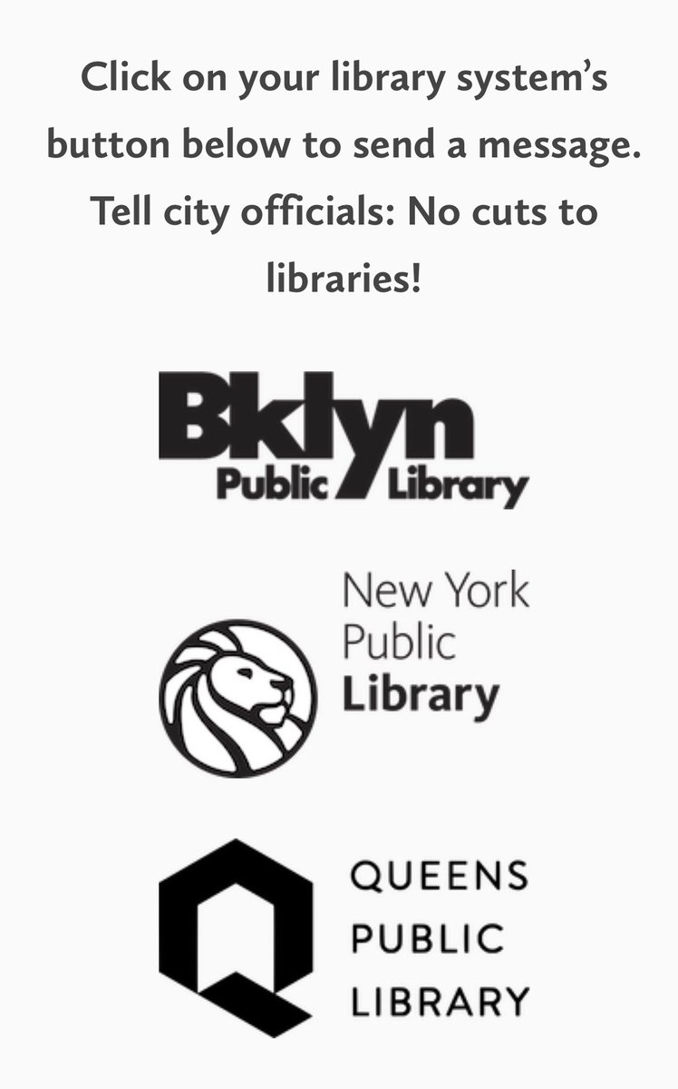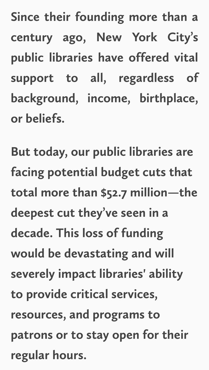 Hi New Yorkers, please take two seconds to send a letter to the city opposing the library budget cuts 🙏🧡 investinlibraries.org