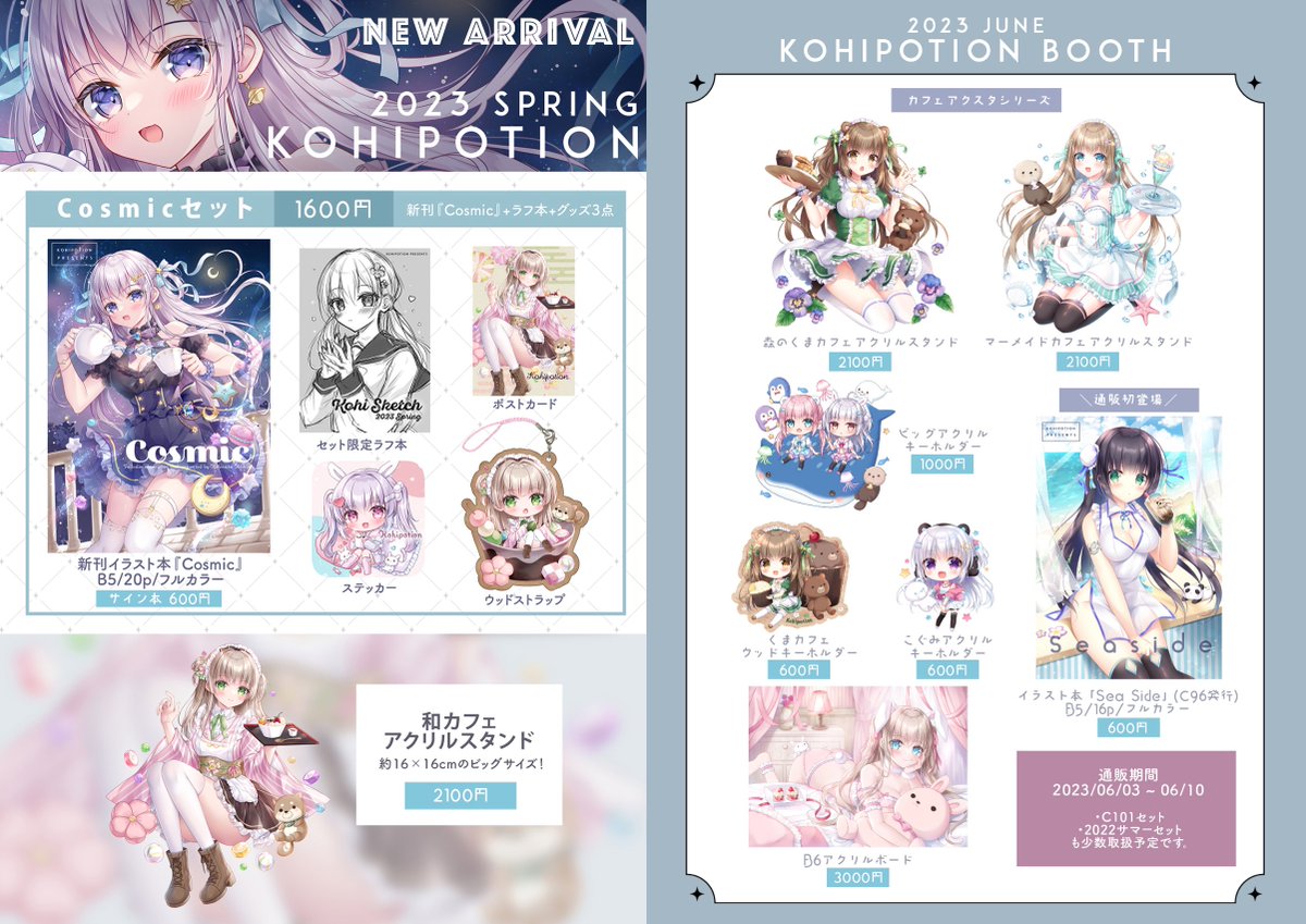 【通販開始のお知らせ⋆͛📢⋆】 春の新作&お蔵出しグッズのBOOTH通販開始しました🌟6月10日までの予定です。 気になるものがあればチェックしてみてください👀 【通販ページ】kohipotion.booth.pm 【詳細はこちら】kohipotion.fanbox.cc/posts/6090887