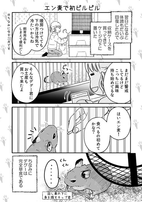 【デグーのチップ君】えん麦で初ピルピル チップ君は一口齧ってみておいしい食べ物だと「ピルピル♪」って短く喜ぶ。かわいいね~😊 #デグー #デグーのチップ君 #漫画 #デグーのいる暮らし #漫画が読めるハッシュタグ