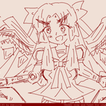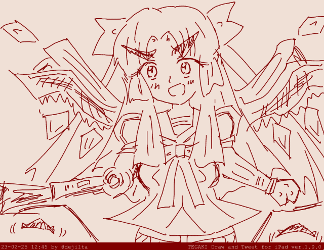 朝倉涼子テキトーアーマー 眉毛はブーメランカッター 右腕はビーム出て銃にも剣にもなる 左腕はロケットパンチ 翼はなんか光って消失させる 胸はデカい スカートの端は鋭利 頭のリボンは自己進化の可能性をリスペクト #tegaki_dt