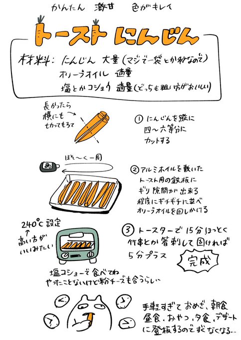 4773 9873 質問いただいたにんじんをトースターでただ焼いて食べるやつマジで簡単すぎて作り方もクソもないんですがにんじん一袋が1〜2日で胃に溶けていくので用法用量に気をつけて作ってくださいね🥕 23/02/04 21:49