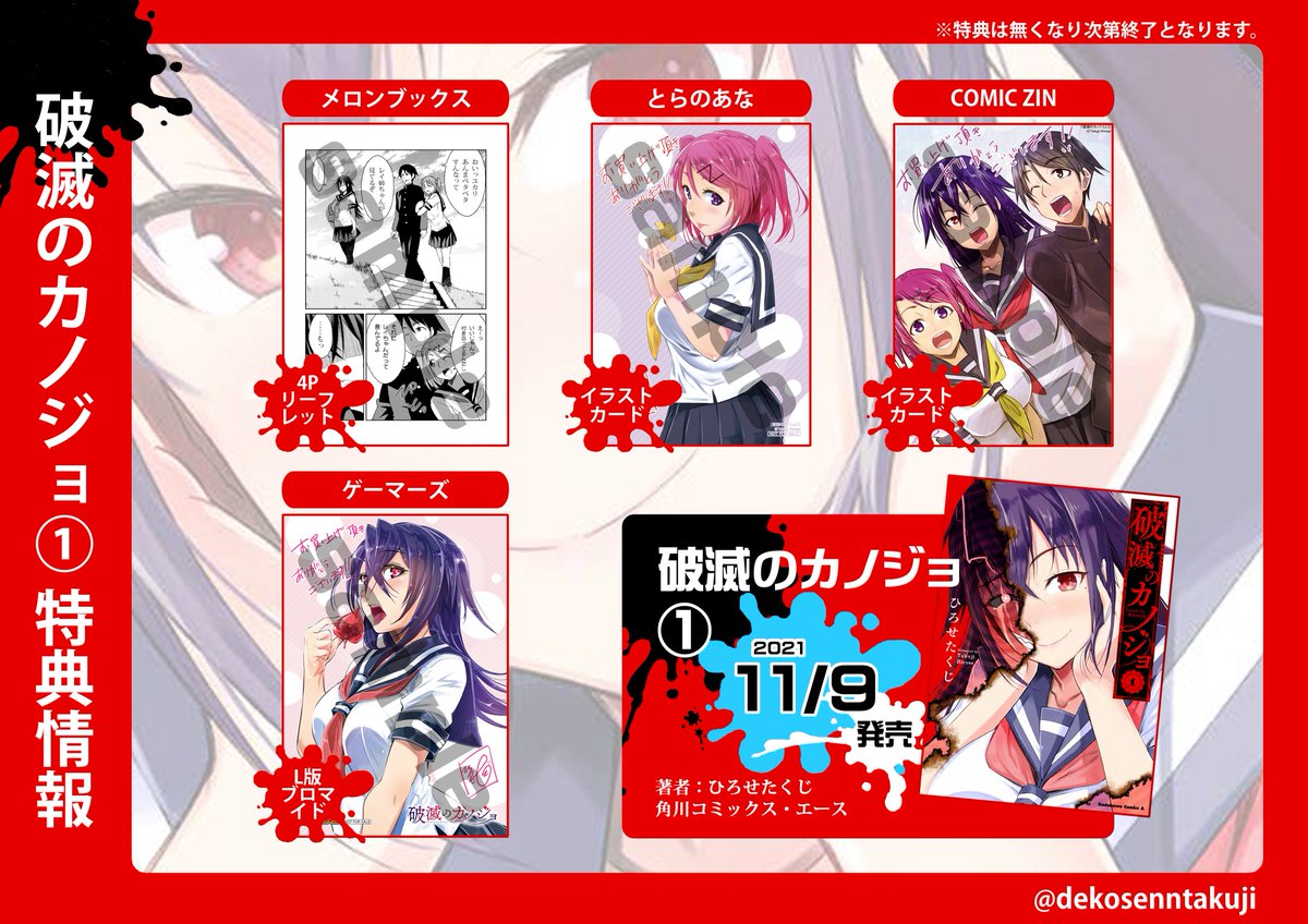 📢お知らせ📢 「破滅のカノジョ」 第1巻が11月9日(火)発売!!! 登場人物全員ヤバイが特にレイコ姉ちゃんが一番やばい!!😱😱 書店特典もたくさん描きおろしました☺ (特典については画像をご参照してください) Amazonさんのご予約はこちら amazon.co.jp/dp/404112008X/…